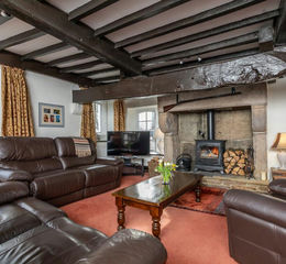 4.4m x 3.9m (19"11" x 18"5"); With feature exposed beams and timbers. Fantastic large stone fireplace housing cast iron log burning stove sat on stone flagged hearth, feature stone mullion windows to the front elevation offering excellent outlooks, television point, built-in storage cupboard with shelving.