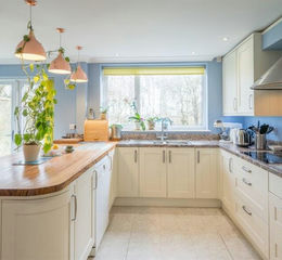 Forming the heart of the home, the kitchen is centred around an island with timber worktop and informal seating. Shaker-style cabinetry and generous work surfaces create a bright and practical environment, complemented by an induction hob, stainless steel sink, and integrated dishwasher. Large windows draw in natural light, while glazed doors lead directly outside.