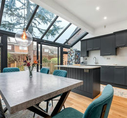 Living/Dining Kitchen - An impressive and spacious kitchen, ideal for family living and entertaining, with a vast array of re-fitted luxury units and appliances, island unit and French doors to the decking veranda over the babbling brook, making this a wonderful Summertime entertaining area.