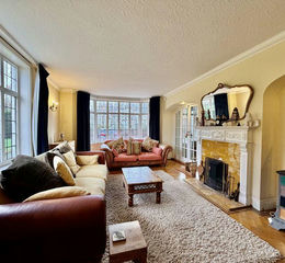1930s parquet flooring with original black border. Dual aspect with leaded light windows to tennis court and leaded light bay window to front aspect. Large ornate marble open fireplace with mirror over to reflect tennis court. Radiators, television point, coving, exposed timber beam, glazed double doors to entrance hall. Covered dual trap door to cellar.