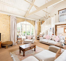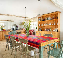 The vaulted, full height dual aspect sitting room has exposed stonework and roof trusses; French doors access the front and rear and there is a wood burning stove. An open plan play room/study comes off the sitting room, overlooking the front garden. The kitchen/dining/family room has French doors to the rear courtyard, a Rangemaster cooker with an extractor fan above, space and plumbing for a dishwasher and room for a dining table and a sitting area.