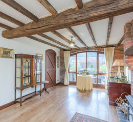 Exposed original beams, a full-height rustic brick fireplace, and elegant oak-style flooring create a living space of warmth and substance; ideal for relaxed evenings or refined entertaining.