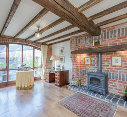 Exposed original beams, a full-height rustic brick, log burner fireplace and elegant oak-style flooring create a living space of warmth and substance ideal for relaxed evenings or refined entertaining.
