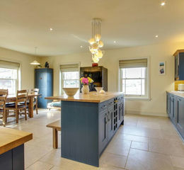 Two sash windows to front, two sash windows to side, sash window to rear, stable door to rear, underfloor heating, range of wall mounted and fitted base units, Rangemaster cooker, hooded extractor over, ceramic sink, tiled splashbacks, integrated dishwasher, centre island housing storage and breakfast bar, pop up A/C + USB point, Limestone tiled floor.
