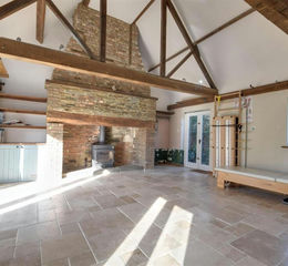 Sitting Room - 6.86m x 5.41m (22'6 x 17'9) - Two sets of French doors to the side with matching side light windows, beautiful travatine flooring with underfloor heating, beautiful vaulted ceiling with large exposed brick and stone fireplace with oak bressumer, fitted Woodwarm Jalock woodburning stove, over a flagstone hearth, further window and French doors to the side elevations enjoying beautiful views to the side. Solid oak staircase with glass balustrade extending to: