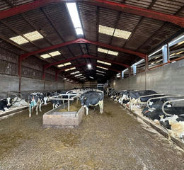 Steel frame, cement fibre roof, slatted flooring with slurry store beneath, 60 cubicles.