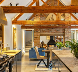 The principal reception space is a series of three, separate rooms occupying one side of the house and all interlinking ideal for family living and entertaining alike with bi fold doors that open onto the courtyard. Particularly impressive, with a vaulted ceiling running through the living rooms, the kitchen area is well appointed with a range of fitted units, integrated appliances and a spacious breakfast island. This opens to the dining space which is ideal for a large table adjacent to a Jack and Jill log burner, which cleverly divides this to an office/sitting room. A more formal sitting room is set to the other side of the kitchen, this generous room has French doors opening to the garden and is adjacent to an inner hallway which introduces the bedrooms along the north-south wing of the barn. The master bedroom occupies the southerly end featuring a large suite with a dressing area and French doors to the courtyard. Two of the remaining bedrooms also have French doors and share a family bathroom whilst a further guest bedroom has an en suite shower room. To the other side of the living area is a further bedroom with en suite and above this a further room, ideal as an office. This makes a wonderful quarters for teenagers or guests.