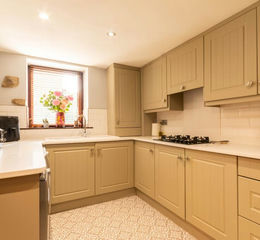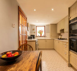 A well-presented kitchen , thoughtfully designed for modern living. The kitchen features an eye-level oven and grill, a porcelain sink, and a built-in gas hob. There is ample space for an American-style fridge freezer, a washing machine, and a dishwasher, making it practical. With room for a dining table, this space is great for both everyday living and entertaining.