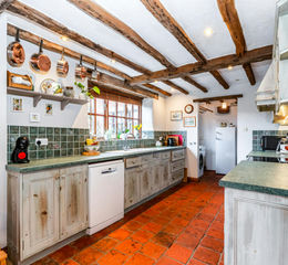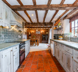 Forming the social heart of the home, the kitchen and dining room combines cooking and dining in one inviting space. A run of timber cabinets with a ceramic sink beneath a mullioned window, quarry tiled flooring, tiled splashbacks and a range cooker beneath a decorative hood anchor the kitchen. Exposed beams stretch overhead, while the dining area features a brick wall and French doors to the rear entrance along with a useful cupboard and access to the living room and utility.