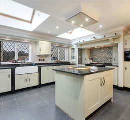 The heart of the home is the spacious kitchen and dining room, which are perfectly suited for family living and entertaining. The kitchen is fitted with an extensive range of traditional wall and base units, topped with contrasting granite work surfaces with upstands. A Belfast sink sits neatly within the worktop, complemented by recessed drainer grooves. A large island provides informal dining space, additional storage and generous preparation surfaces. The focal point of the kitchen is the traditional cream Aga, recessed attractively within an inglenook with a tiled splashback. Natural light floods the room through wooden double-glazed windows and rooflights, supported by recessed ceiling spotlights. Integrated appliances include a dishwasher and microwave, with space for an American-style fridge freezer. The room is finished with tiled flooring and comfortably accommodates a family dining table or could be arranged as a combined living and dining space if preferred.