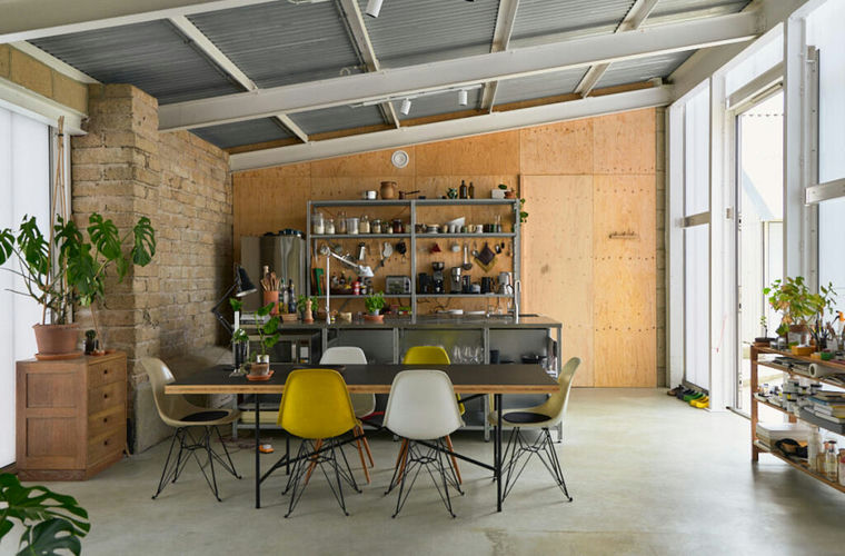 The interior layout is clearly defined, with living and cooking zones divided by a central dining table. Underfoot, polished concrete flows throughout, complementing the utilitarian stainless-steel kitchen island, with integrated Miele appliances. Exposed shelving draws the eye upward to the vaulted ceiling and pared-back ply wall. Behind the kitchen, a large door leads to a practical zone comprising a W/C, pantry, and the primary entrance that has ample room for coats and bags.