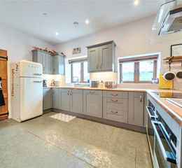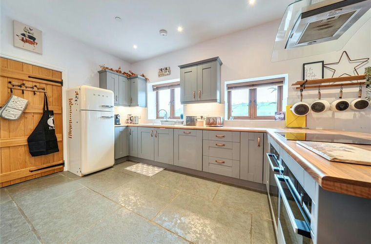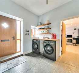 Stepping through the front door, you enter a welcoming hallway laid with flagstone flooring and underfloor heating. This practical space also serves as a utility/boot room. A door to the left opens into the impressive open-plan kitchen, dining, and living area.