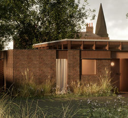Set within a historic walled garden, the low-lying home is designed for privacy and quiet connection to place. A modest brick façade blends with the existing walls, while the rear opens into a sheltered, sunlit enclosure with views to the church beyond. The architecture is crafted from simple, enduring materials—wood and brick—to create a home that feels both timeless and intimately connected to its surroundings.