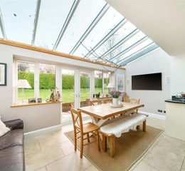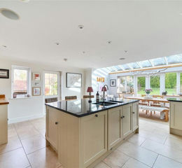 Large family kitchen/breakfast room with glazed side extension complete with space for table. Beautifully fitted kitchen incorporating a comprehensive range of painted wooden units at base and eye level with granite worktops. Matching island unit with 1 1/2 bowl stainless steel sinks and drinking water tap. Gas fired Falcon range cooker with electric ovens and extractor over. Range of integrated appliances including Bosch dishwasher, wine fridge and microwave. Hard wired Bluetooth enabled amplifier system in ceiling. Double doors to rear terrace and garden and separate single door to side. Underfloor heating (2 zones).
