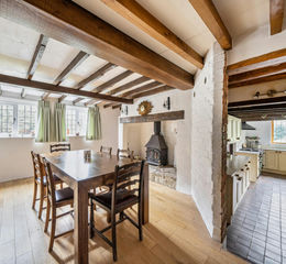 Internally, the house is rich in character features throughout. The entrance hall welcomes you with carpet flooring, exposed beams and useful storage, while the triple aspect drawing room is a particularly attractive space with a large inglenook fireplace and double doors opening out to the front garden. The double aspect kitchen/breakfast room is practical and well arranged, fitted with a good range of cupboards and work surfaces, with additional space and plumbing for appliances. Adjoining the kitchen is a useful utility area/boot room with a door opening out to the rear aspect. Further rooms to this level include a ground floor guest bedroom with en-suite shower room and a cloakroom.