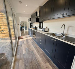 26' 7" x 11' 5" max 4'10" min (8.10m x 3.48m max 1.47m min) UPVC double glazed french doors to the front aspect, UPVC double glazed door to the front aspect, being fitted with a range of wall and base unts with built in oven, hob, extractor, sink/drainer, ceiling spot lights and two radiators.
