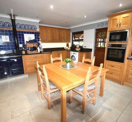 16' 1" x 18' 4" (4.90m x 5.59m) with recently installed custom made oak kitchen, granite worktops, ceramic Butler style sink with mixer tap and granite drainer, NEFF oven and grill, NEFF microwave, oil Rayburn (hot water and cooking), space for American fridge/freezer, induction hobs with extractor over, washing machine connections, dishwasher connection, tiled flooring, spotlights to ceiling, windows to front with countryside views, tiled splashback, side access to: