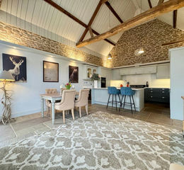 The undisputed heart of the home is the stunning open-plan kitchen, dining and living area - a truly standout feature. This impressive space perfectly balances character and contemporary design, creating a warm, sociable setting ideal for both everyday family life and entertaining guests. Exposed stone walls and carefully preserved original features bring texture and depth, while sleek modern finishes and thoughtfully designed lighting enhance the sense of light and space. The seamless flow between cooking, dining and relaxation areas ensures the room is as practical as it is visually striking, delivering a superb central living environment. The kitchen is beautifully appointed with quartz worktops and a comprehensive range of built-in Neff appliances, including a full-length fridge, full-length freezer, dishwasher and induction hob. Further practical features include a discreet built-in bin, an integrated wine fridge and a high-end AGA, combining everyday functionality with refined style. Within the living space, a log burner provides a charming focal point and a cosy atmosphere, while beautiful Indian stone flooring runs seamlessly throughout the room and into the hallway. Double doors open out to gardens on either side of the property, creating a wonderful connection between indoor and outdoor living. From one side, there is a particularly pleasant aspect with views across to the village church, adding to the charm and setting of this exceptional home. Finishing this space is a useful utility room.