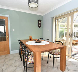 The welcoming front door opens into a spacious hallway with a cloakroom conveniently positioned to the left. To the right lies a bright and airy sitting room running the full depth of the house, featuring an attractive inglenook-style fireplace with flue, ready for a wood-burning stove. Double doors open through to the dining room, which in turn leads via sliding doors to a light-filled conservatory overlooking the garden.
