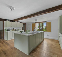 The drawing room is an enchanting triple aspect space with a handsome redbrick chimneypiece with an inset wood burning stove, exposed timbers and studwork. Partially glazed double doors lead to the garden.