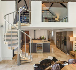 Internally, the property is centred around a spectacular open plan kitchen and dining space, beautifully designed for modern living and entertaining, with a striking central island, vaulted sections, quality fitted cabinetry and an effortless flow through the ground floor. The magnificent drawing room is a standout feature, with its dramatic full height ceiling, exposed timbers, excellent natural light and an impressive sense of volume. A central fireplace adds warmth and character, while a mezzanine level above provides a versatile additional reception area, ideal as a snug, reading area or study.