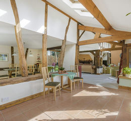 A separate study/reception room offers excellent versatility, featuring vaulted ceilings, exposed beams and dual aspect windows overlooking the gardens — ideal for home working or as an additional sitting room.