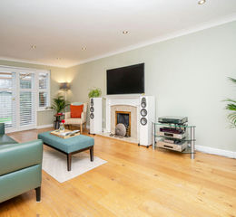 To the left, the living room spans the full length of the house. A beautiful marble-surround feature fireplace takes centre stage with a wall-mounted TV above, and there’s plenty of space to arrange sofas around it. This dual-aspect room is filled with natural light from a front-facing window and double doors opening onto the patio. The garden is mainly laid to lawn with multiple seating areas, creating the ultimate space for garden parties and summer get-togethers.