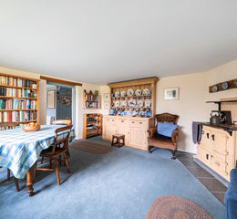 Originally the farmhouse for Patsford Farm, this characterful home is constructed of rendered stone beneath a slate roof and follows a traditional longhouse design, complete with period features including exposed beams, lintels, and an inglenook fireplace.
