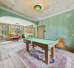 Set behind a lush, secluded frontage on Mile End Road, the five bay London stock brick façade opens to four atmospheric storeys spanning almost 4,400 sq ft. The house offers six bedrooms and a sequence of elegant reception rooms enriched with period detail: aged pine floors, original panelling, fine marble and bolection fireplaces, incised lime-plaster walls, Regency cornices, and beautifully distressed joinery. Craftsmanship is of the highest order, undertaken by artisans responsible for many of Spitalfields' most revered restorations.