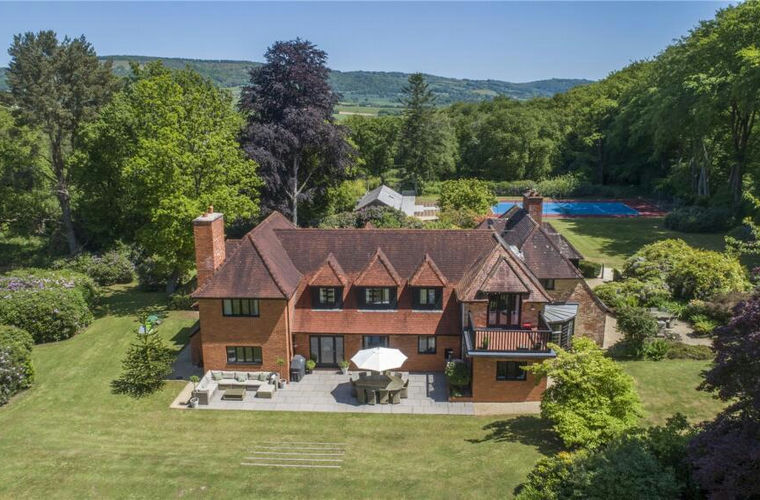 A wonderfully situated country house, in the arts and crafts style, within beautifully timbered grounds with tennis court, pool and garden pavilion.