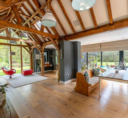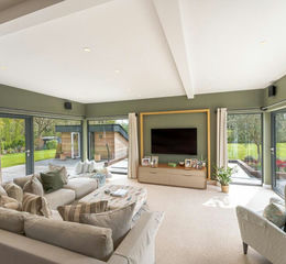 The ground floor boasts an impressive open-plan living space centred around a spectacular 38ft kitchen/dining room. This room, with its vaulted ceiling, exposed beams, and oak flooring, is bathed in light from bifold doors leading to a raised patio and large windows with 360° views of the gardens and lake. The custom-designed Italian kitchen is both functional and stylish, featuring a double oven, induction hob, and a large island with solid granite worktops. A banquette seating area for ten provides the perfect space for entertaining.