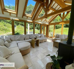 Dimensions: 18' 11'' x 13' 2'' (5.76m x 4.01m). Having wood burner, tiled flooring, wall mounted air sourced heat unit, double glazed windows around, Velux windows, single door to the side and further patio doors leads to the rear.