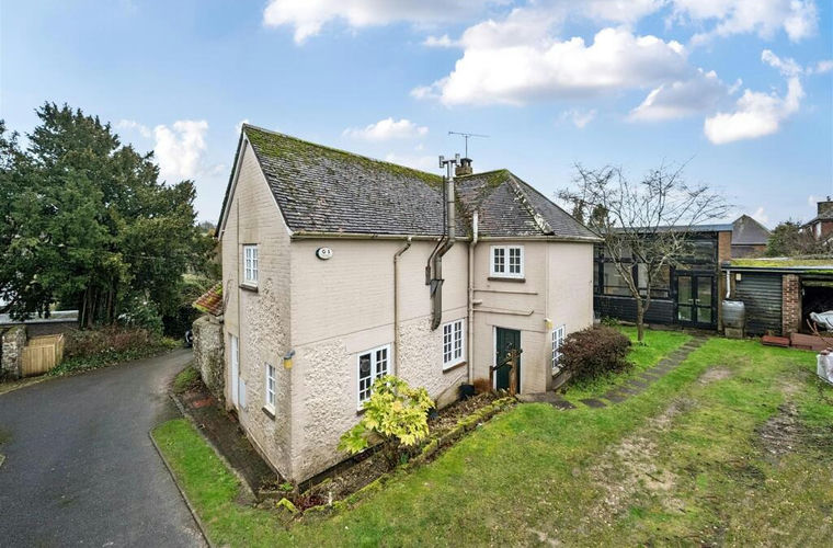 Outside, the property is surrounded by attractive gardens. To the front are two charming flint-walled gardens, while to the rear there is a substantial vaulted art studio and two garages positioned against an old flint wall. Beyond the house lies a large paddock of approximately 1.75 acres, divided into three sections and including two small pony stables. A driveway runs along the right-hand side of the property, providing access to the rear gardens and paddock.