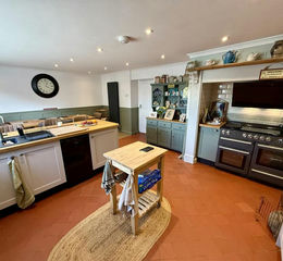 Farmhouse Style Kitchen/Dining Room - 6.40m x 3.96m (21' x 13') - Very attractive traditional farmhouse style kitchen / diner with oak work surfaces, breakfast bar, extensive range of base units, 1 1/2 bowl sink, tiled flooring, down lights, integrated dishwasher, cooker hood & inset for fridge freezer.