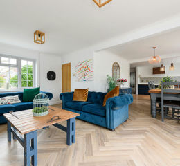 Recently renovated by the current owners, the property has been finished externally in bright white render and offers stylish, well-balanced accommodation arranged over two floors. An open porch leads into a welcoming entrance hall with stairs to the first floor and direct access to the spacious, open-plan ground floor. The heart of the home is the expansive living space, thoughtfully designed for modern family life. The well-equipped kitchen features built-in appliances including integrated recycling bins, fridge freezer, dishwasher, and a striking Bertazzoni Range Cooker, all complemented by ample storage cupboards. The kitchen opens into a generous dining area and living room with patio doors to the garden, a feature fireplace with inset wood-burning stove, and access to the former garage—now a versatile family/games room. A separate utility room sits just off the kitchen, with wash facilities, space for a washing machine, tumble dryer, under-counter fridge, and chest freezer. This room also benefits from convenient access to both the front and rear of the property. Upstairs, the master bedroom includes built-in storage and a contemporary en-suite shower room, accompanied by three further double bedrooms and a modern family bathroom.