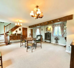 Step through the front porch into the huge reception dining hall, an impressive spectacular first ideal for dining or as a central hub for family and friends to socialise or unwind whilst taking in the charm of the cottage, with beams to the ceiling and a centrepiece fireplace to name a few character feature that run throughout this wonderful home. . Moving to the right is the kitchen/breakfast room, equipped with ample cupboard space for kitchen storage whilst providing an area for family dinners or kitchen catch ups. Adjoining to the kitchen is the utility room offering a separate space for white goods and added storage accompanied by a easily accessible WC. Finally the ground floor benefits from a sitting room leading into a light filled conservatory with French doors opening out to the garden. Perfect for quiet afternoons enjoying the sun and views of the garden or a fantastic play room for younger members of the family.