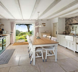 The principal home at Hatchwell Hall offers a wealth of period charm, on the ground floor, the kitchen/breakfast room is clearly the heart of the home, fitted with bespoke wooden cabinetry, and integrated appliances, centred around an Aga. Double doors open directly onto the patio and gardens, creating a seamless connection between indoor and outdoor living. A utility room with a cloakroom/WC lies adjacent to the kitchen.