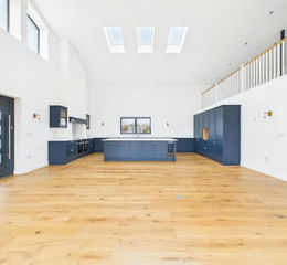 The entrance opens into a stunning open-plan kitchen/lounge/dining space, flooded with natural light from six Velux windows and bi-folding doors to the garden, and enhanced by impressive double-height ceilings and engineered oak flooring. The bespoke kitchen features a large central island, integrated Neff appliances, quartz worktops and an inset sink with Quooker tap, creating a superb focal point for modern living and entertaining.