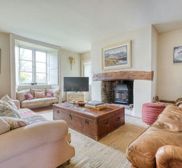 A flagstone pathway leads through the garden, up to the front door, which enters the welcoming entrance hall, which connects the main living rooms of the house. To the left-hand side, there is an elegant sitting room with French doors to the courtyard at one end and a cosy seating area at the other, enjoying dual aspect windows with shutters, and a fireplace with an inset wood-burning stove. Oak floorboards span the room.