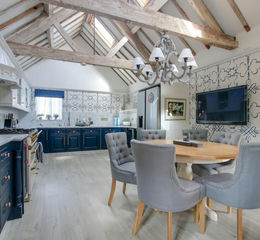 - Generous dining room with a vaulted ceiling with exposed timbers and a brick open fireplace