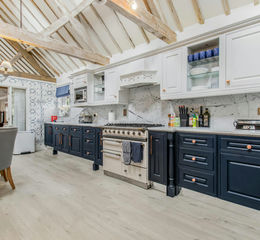The heart of the home is the spectacular kitchen/breakfast room, with a soaring limed oak vaulted ceiling and a full suite of bespoke cabinetry topped with fine marble worktops and splashbacks. Integrated appliances include a range-style cooker with five-ring gas hob, microwave, dishwasher, twin wine coolers, a new American fridge/freezer, washing machine, washer/dryer, and an instant boiling water tap.