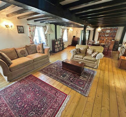 Dimensions: 8.397 x 7.464 (27'6" x 24'5"). With exposed original beams, exposed timber flooring, dual aspect mounted Economy 7 electric heaters, power points, two, uPVC sash windows to the front elevation and a uPVC long glazed panel to the front elevation. ?Large inglenook incorporating an ornate large cast iron multi fuel burner with beam exposed above and stairs to the first floor off. A step down and double timber glazed doors lead into the