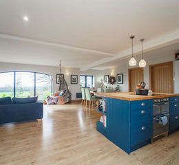 Three UPVC double glazed windows, central heating radiator, range of wall and base units with wood surfaces, centre island, Belfast sink with draining ridges and mixer tap, integrated oven and grill, four ring electric hob, integrated dishwasher and fridge freezer, spotlights, laminate flooring and doors to reception room three and office.