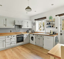 Kitchen/Breakfast Room - with range of cupboards and wood block work surface incorporating sink, Neff four ring electric hob with oven and grill below and filter hood over, built in fridge freezer, space for washing machine and dishwasher. Stable door to garden.