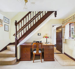 The front door opens into a welcoming hall, which is also used as a study area, with a window framing garden views.