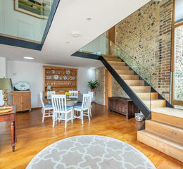 FAMILY/DINING ROOM A spacious and airy room with a full-height rear window, engineered oak flooring, exposed flint wall, and oak staircase rising to the first floor.