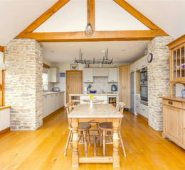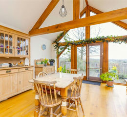 The accommodation is arranged across two connected living spaces, allowing the property to function as a generous single family home or as two selfcontained areas, ideal for multigenerational living or potential rental income. The original cottage includes a bright entrance hall, cloakroom, a spacious living and dining room with a wood burner, and a modern, wellequipped kitchen. Upstairs, two generous double bedrooms sit alongside a stylish shower room and excellent builtin storage.The adjoining converted barn provides further selfcontained accommodation, beginning with a rear entrance hall, cloakroom, study and a utility room with walkin storage. Two additional double bedrooms each enjoy ensuite access, and a cosy snug with a wood burner opens onto the garden through French doors. The standout feature is the impressive openplan kitchen and dining room, where oak flooring, a highspec kitchen with an island, and farreaching views across the grounds create a stunning everyday living space.