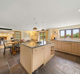 A sizeable dual aspect kitchen/dining room offers a practical and sociable setting, featuring a central island unit, integrated appliances, classic cabinetry, and ample space for entertaining. Whilst the clearly defined dining area has double doors onto the sunny garden terrace. Beyond the kitchen is a useful utility room and cloakroom WC.