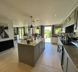 The dual-aspect sitting room is ideal for entertaining guests or simply relaxing with the family. It features an exposed brick inglenook fireplace with a fitted log burner, adding warmth and character. To the rear, the open-plan kitchen and dining room offers a bright, sociable space with lovely views over the garden and open countryside, perfect for both everyday living and hosting.