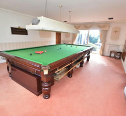 Off the entrance hall to the left is a versatile library room leading through to the large family room, currently displaying a full sized snooker table. This room incorporates a concealed bar, separate study, and sliding patio doors leading out in to the gardens.